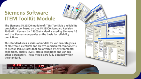 The Siemens SN 29500 module of ITEM ToolKit is a reliability prediction tool based on the SN 29500 Standard Revision 2013-07. Siemens SN 29500 standard is used by Siemens AG and the Siemens companies as the basis for reliability predictions.